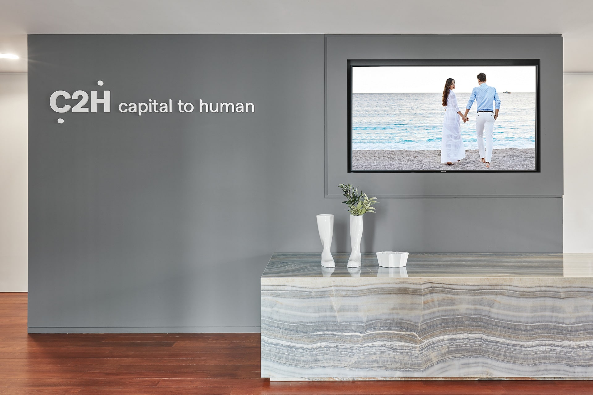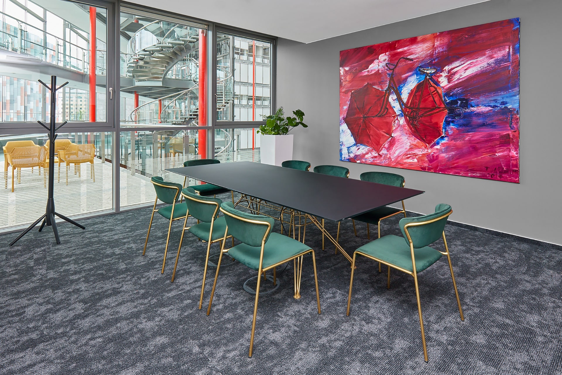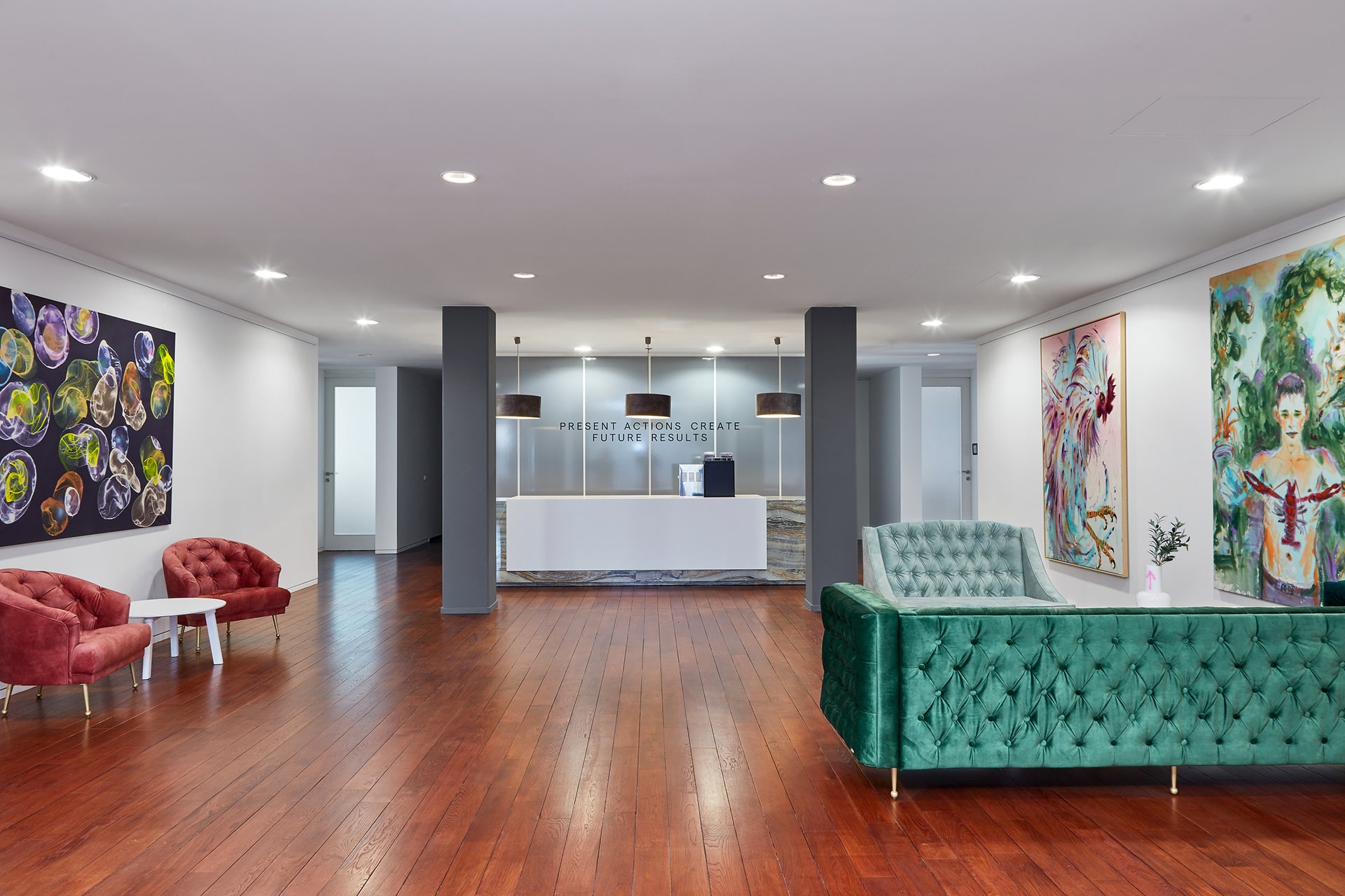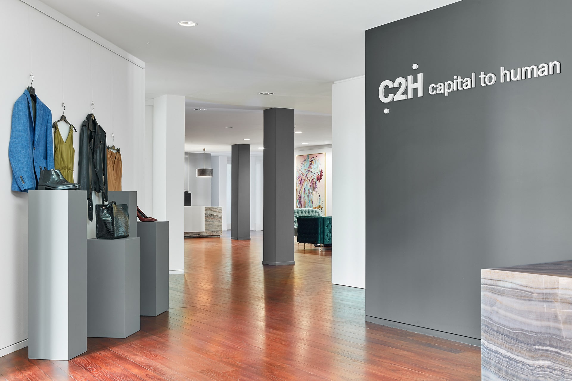 Interier design návrh a realizace klientské zóny investiční skupiny C2H do které patří módní značky PF, Kara a Etam. headquarter společnosti se nachází v ikonické budově Nile House v Karlíně, 2019.